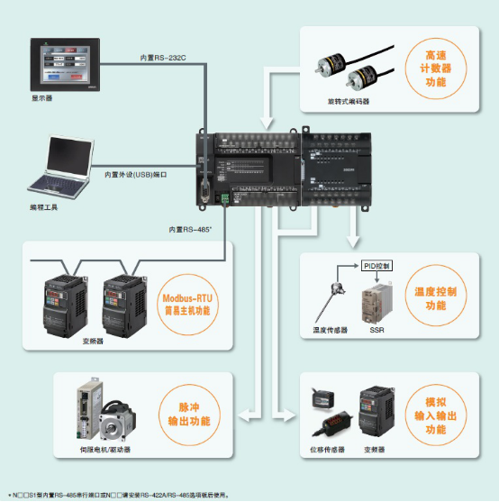 應(yīng)用機(jī)型(CP1E-N□□、N□□S(1))內(nèi)置高速計(jì)數(shù)器功能、脈沖輸出功能、串行連接端口。